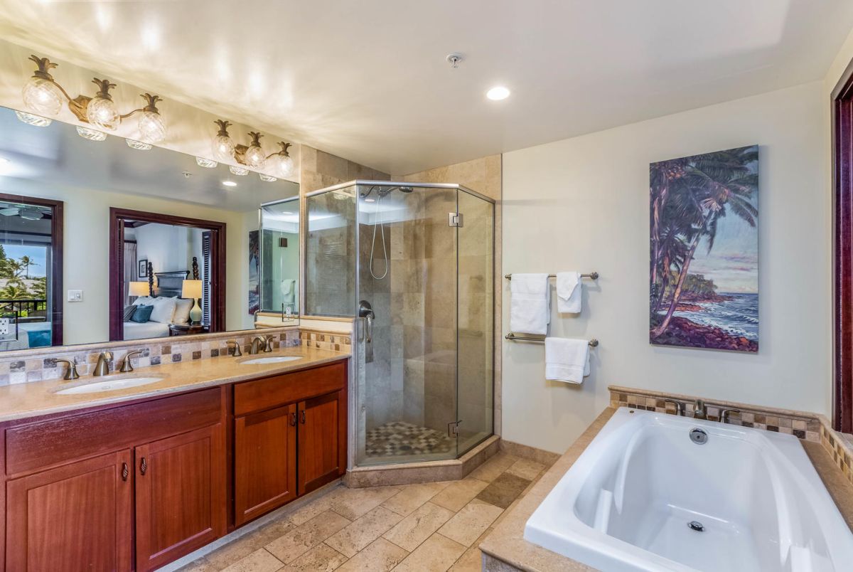This 2 bedroom condo has a king bed in the master bedroom suite with a desk, dresser, closet and private master bathroom with shower and tub; a second master suite with a queen bed and master bathroom with a soaking tub and an attached third bathroom with a shower. In total, there are two tubs, two separate showers, five sinks, Peruvian Travertine surround and granite slab counter tops.
